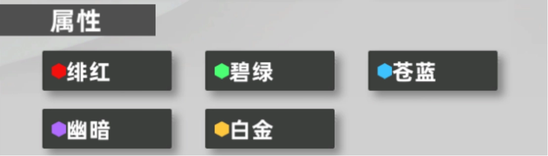 属性克制关系如下:绯红对碧绿具有克制效果,碧绿克制苍蓝,苍蓝则克制绯红;而幽暗与白金之间存在相互克制的关系。