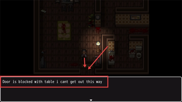 当出现【Door-is-blocked-with-table-i-cant-get-out-this-way】提示时,不必再尝试当前这扇门,转而在房间的其他区域继续探索,寻找可以离开的出口。