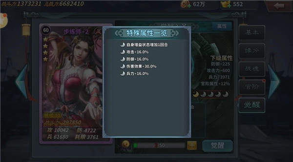 觉醒功能在武将等级达到60级时解锁。消耗道具“道石”,可对不同统帅值的武将进行觉醒操作。觉醒不仅能提升武将的基础属性,还会解锁专属的觉醒属性,从而大幅增强武将的整体能力。