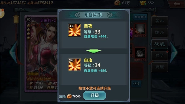 战魂进阶:进阶主要提升魂技等级上限,同时解锁更多的魂技,需要消耗“魂玉”与武将信物,可用万能信物代替使用提升。