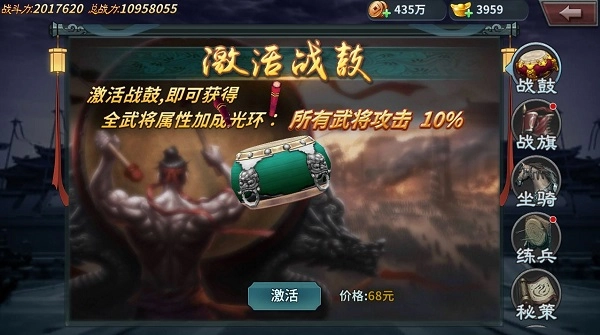 激活战鼓可以为全武将提供百分比属性加成效果。