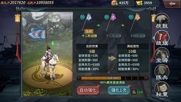 对战旗能够开展强化操作,强化过程需要消耗“灵漆”,强化时存在直接升至满级的概率,成功强化后可获取大量全属性的提升。