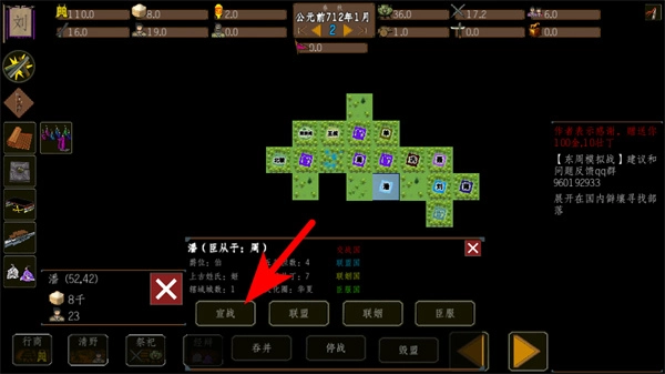 找到箭头所指的宣战选项并点击,以此触发势力间的互动——这是推动游戏进程的基础步骤,只需依照提示操作就行。