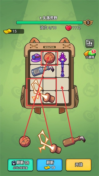 在【失落荒野-波次3/10】的背包界面中,对【篮球】等装备进行合成升级操作,完成输出道具的强化后,点击【开战】按钮即可进入该波次的战斗。