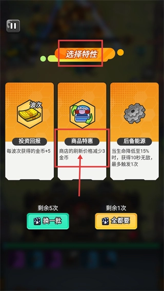在【选择特性】界面时,建议优先选择【商品特惠-商店刷新价格降低3金币】这一特性,这样能够减少后续获取装备的成本,从而更好地帮助推进关卡。