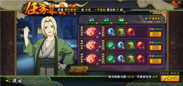 3、日常任务更轻松,基础日常十分钟左右就能搞定,每周累计活跃值达到500,就送密卷等火影忍者相关道具材料