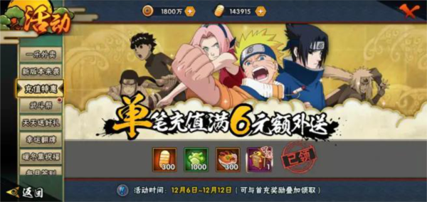 16、游戏会在特定时间推出充值特惠活动,例如单笔充值6元可获得300金币、1000声望、300体力以及5片B忍碎片(任选其一);25元的特惠活动因为没有金币奖励,通常很少有人特意去充值;而50元的充值活动则值得考虑,其奖励包含500忍玉、500体力、50秘术之星和2片S忍碎片(任选其一)。