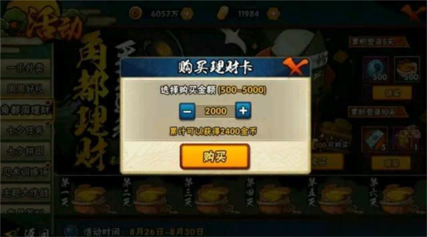 7、任务集会所 过去能产出50、100金币,特殊节假日的福利很丰厚;游戏里设有每周登录活动,第三天可领取180金币,这样算下来一个月能拿到4×180=720金币;此外每月签到还有50金币,决斗场的任务宝箱也有概率随机掉落金币,不过这部分不是固定数值,得看运气;要是你已经拥有A忍,偶尔一些A忍体验卡也会附赠金币。