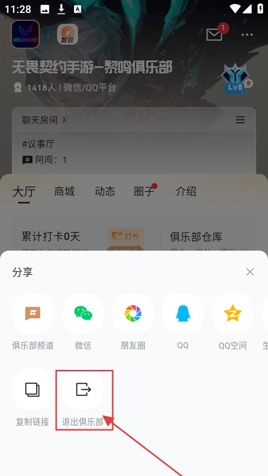 进入俱乐部后,点击右上角的三点图标即可打开操作菜单,里面包含分享、退出俱乐部等实用的功能选项。