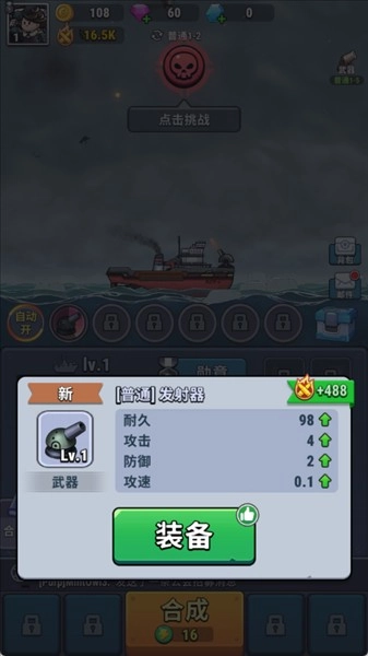 进入游戏界面后,点击【合成】按钮就能得到随机装备。这些装备本身带有属性值,要是合成出高等级装备,可直接装配到战舰上,能显著增强战力。