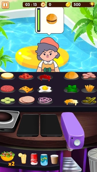 2、通过完成顾客订单和达成一些小挑战,逐步积累金币,慢慢把你的汉堡小摊发展成连锁大店。
