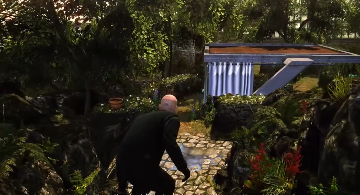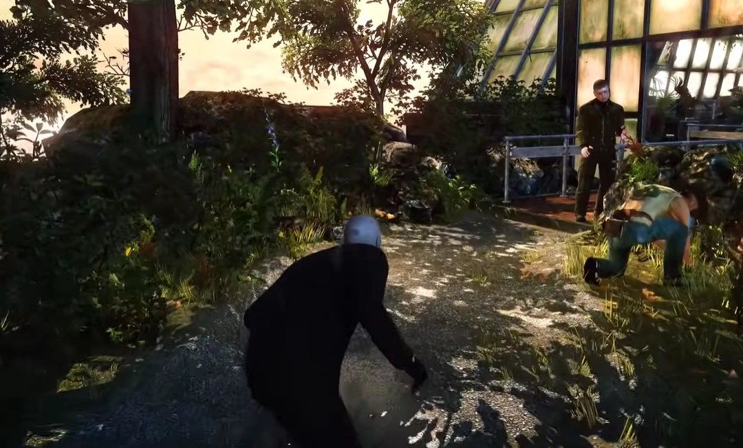这款游戏新增了掩体机制。你可以藏在树干后面,用消音手枪解决掉第二个守卫,然后把他的尸体丢进垃圾桶里。接着往前走,网球场那边有个正在打电话的守卫,你既可以用钢丝勒死他,也能悄悄绕过去。再往右拐走下石阶,解决掉第四个守卫后,把尸体拖到角落里。转角的地方有个存档点,记得手动保存进度。
