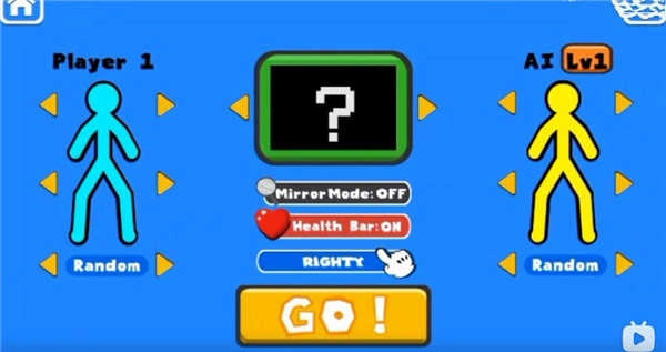 1、打开至尊决斗者火柴人游戏后,玩家既可以选择“人机对战”或“1v1模式”,也能邀请好友来一场紧张刺激的1v1对决。