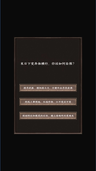 1、打开《我在末世开超市》后,点击开始按钮,接下来会弹出几个选项,你可以依照自己的直觉来选择;