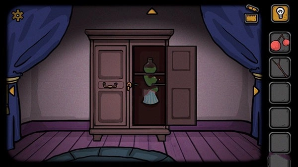 有个密码需要按特定方向和次数操作——先往左边动三次,再往右边动五次,最后往左边动两次,听起来是不是有点绕?这个密码是用来操作大门上那个铃铛的。得从莉莉的房间出发,一直往右边切换场景,走到房子的大门那里就能看到那个铃铛了。找到铃铛后,按照刚才说的顺序:向左摇晃三下,向右摇晃五下,再向左摇晃两下,这样就会掉下来一把钥匙。这把钥匙正好能打开衣柜,打开后就能拿到魔药和衣服了。