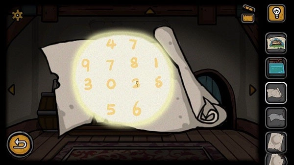 接下来我们要使用这个太阳魔法卷轴,先点击安娜的房间,再点击她桌上的小灯,之后拿出太阳魔法卷轴就会出现一张数字图,这样我们就能发现里面的内容了(是带有密码的)。