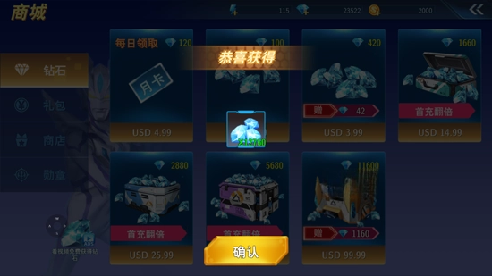 在弹窗里点击确认,无需支付,就能成功获取相应数量的钻石。