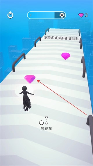你需要操控角色,让他驾驶独轮车在赛道上前进,途中要收集粉色的钻石。每成功收集到一颗钻石,就能得到对应的分数和爱心值。