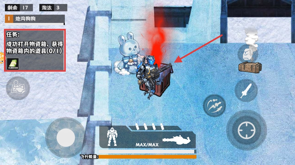 根据任务要求,打开带有红烟标识的物资箱,获取所需道具以完成任务,请留意场景内的箱子并及时开启。