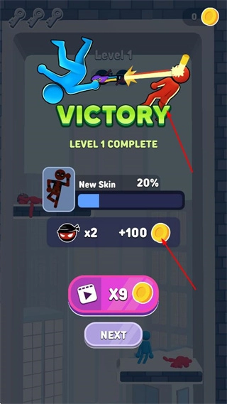 成功打败敌人、通过关卡后,就能得到金币、道具等奖励,还能解锁新皮肤。之后你可以选择观看视频让奖励翻倍,或者直接进入下一关。