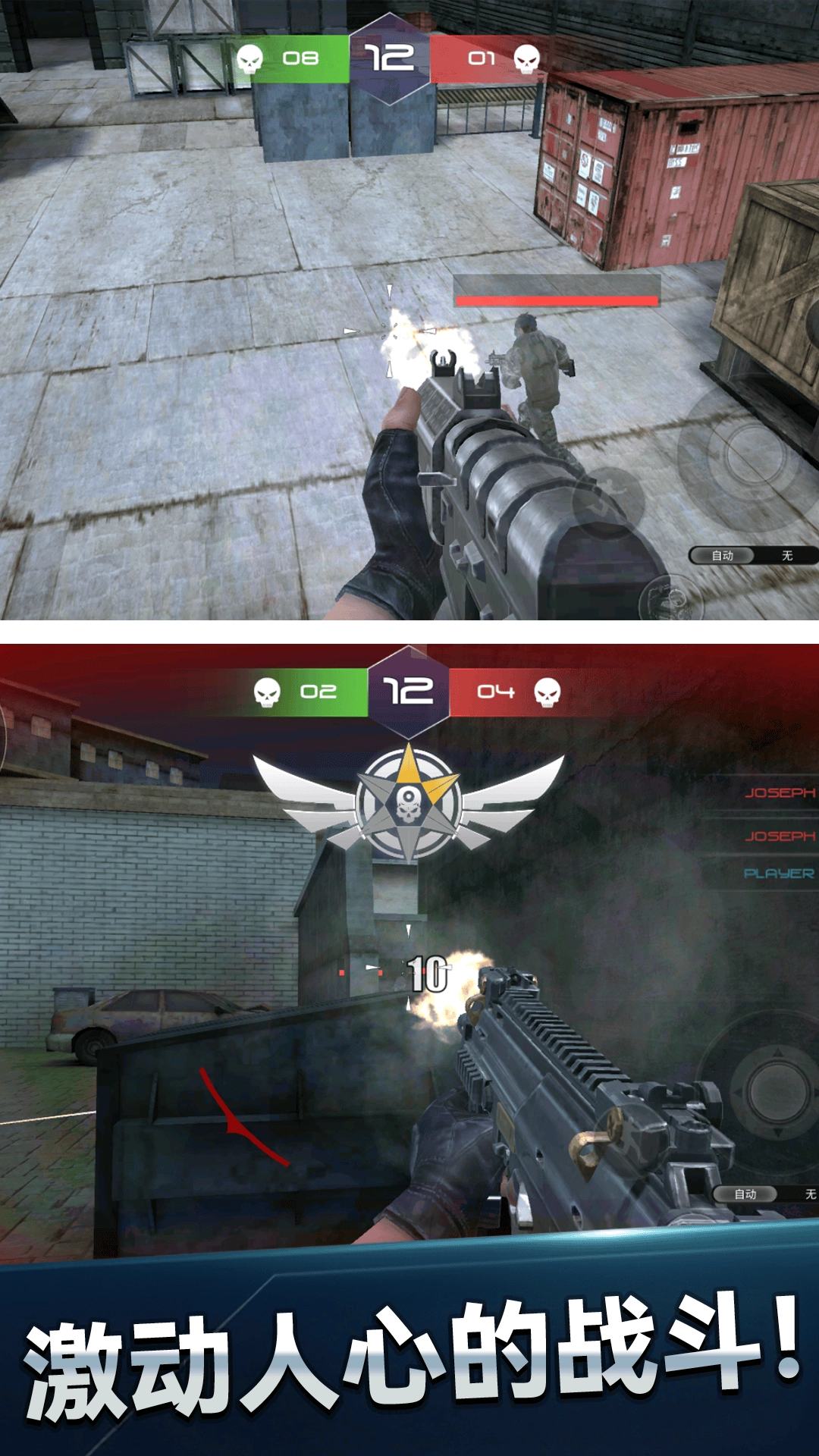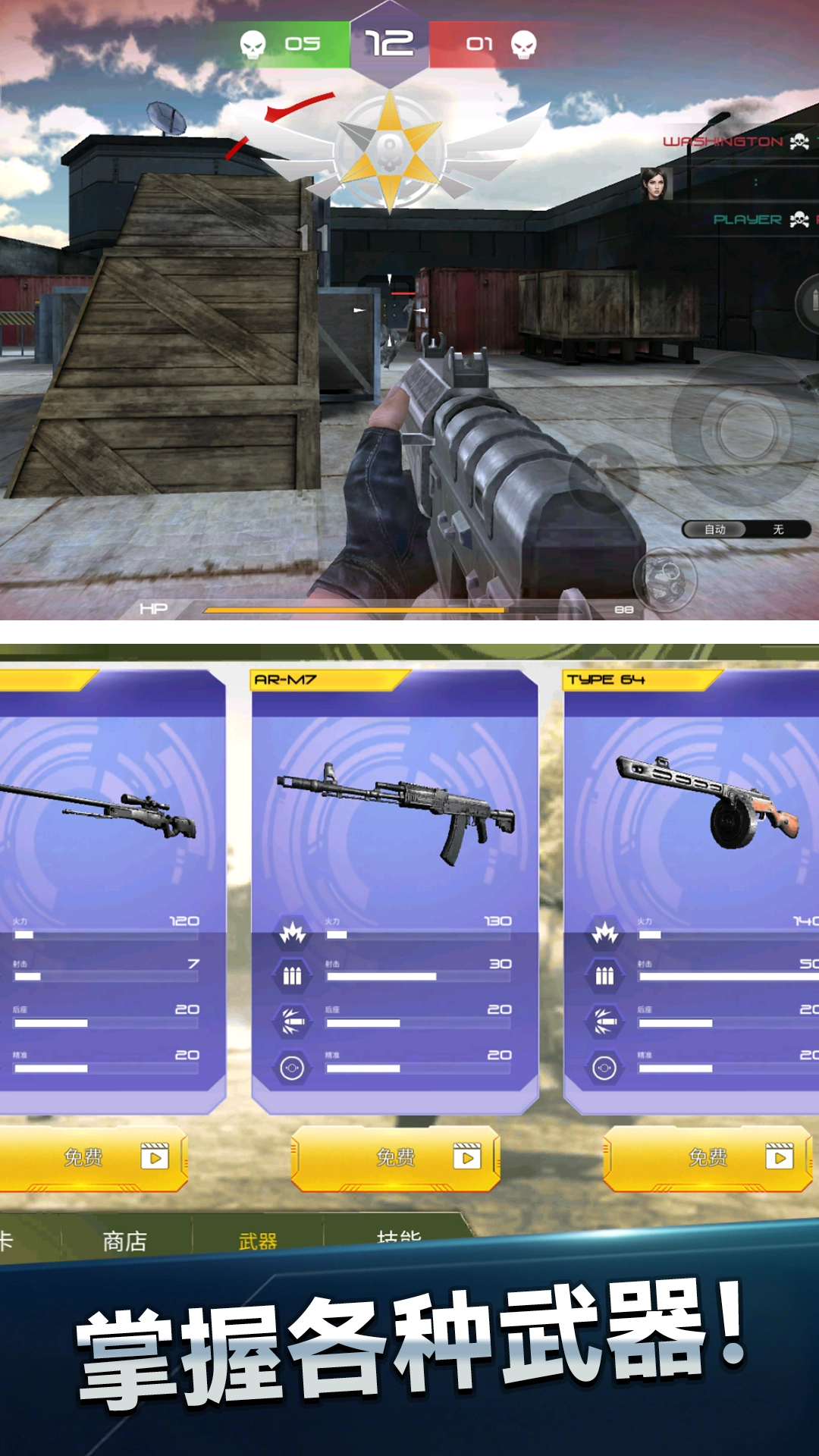 《火线战场》是一款简单易上手的枪战射击游戏,在这里你能体验到热血沸腾的战斗玩法。游戏内有各式各样的武器可供解锁使用,你需要完成一系列作战任务,同时为自己配备好防具,灵活操控角色移动,寻找合适的作战位置潜伏起来伏击敌人,一定要注意自身安全哦!