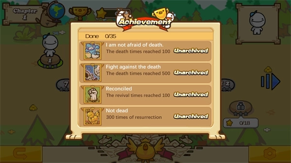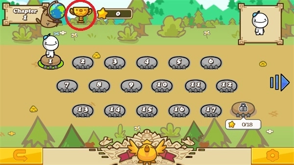 2.进入关卡页面后,能看到章节、人物造型、设定等内容,红圈标注的奖杯对应的是成就列表。