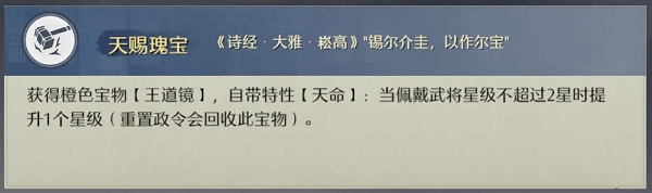 当然我们千万不要忽略了王道政策中的天赐瑰宝,在低星级时是能额外增加1星的,可以快速提升核心武将战力。