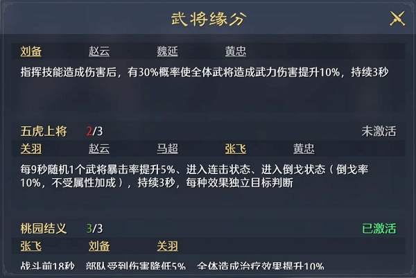 部分武将之间存在一定的缘分效果,可以在每个武将的缘分模块单独查看,一旦缘分激活则会有不同的增益效果。