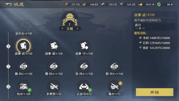 其中军事府能够提升武将的带兵数量,对武将战力的增强比较明显,资源充足的情况下可以优先提升。