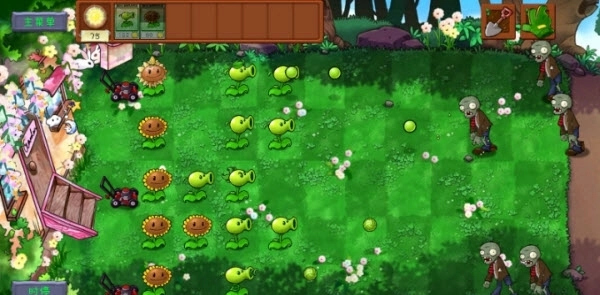 2、点击草坪区域来布置植物,搭建起防御阵线,阻挡僵尸一步步靠近房屋的核心区域。