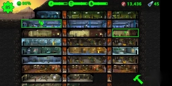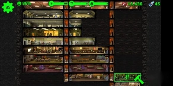 你可以自由规划避难所的布局,搭建各式各样的房间,像居住区、生产设施、娱乐设施之类的都能建造。