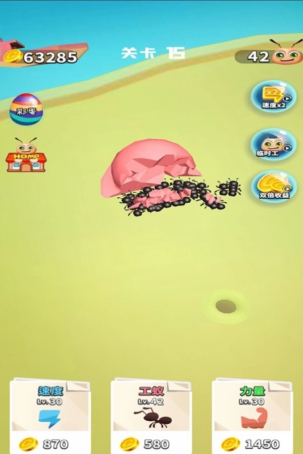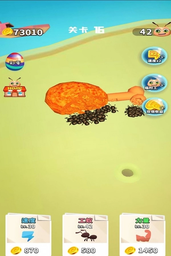 蚂蚁大战在小蚁群存在的时候所经过的道路上不会留下任何食物这些食物都可以被带走。在这个有趣而简单的闲置游戏中是时候掌管蚂蚁群落了。搜集食物发展蚂蚁部落取得胜利了。起初尽管只有一只孤独的蚂蚁。