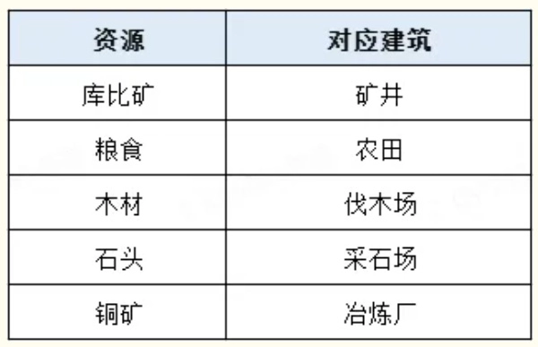 1、下表为基础资源以及产出该资源的对应建筑,玩家可以直接看一下。