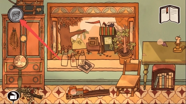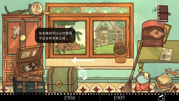 1、【此步骤主要是游戏中的操作提示,可跳过】根据操作指引打开箱子取出日记本,切换到1909年场景,先把水壶里的花朵拿出来再点击水壶;接着回到1908年场景点击喷头,将水壶和喷头组装成新的水壶;之后用组装好的水壶给窗台的花盆浇水,再切换到1909年场景,取走窗台上的硬币