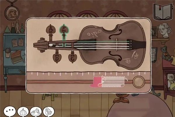 4、【女主1908】点击小提琴进入游戏,完成游玩后可获得纸张——游戏操作方式为:当音符对齐时点击右侧圆形按钮(也可在即将对齐时提前点击);若遇到长段音符则需按住按钮保持不动;游戏分为4根弦的关卡,难度会逐级提升;此外,最后一段的虚线音符同样会移动。