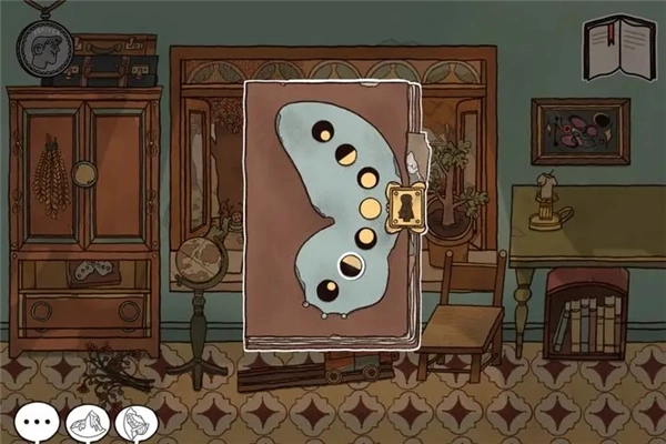 8、【男主1909】点击柜子上层的一排抽屉,取出日记本,按照刚才看到的红色图示调整蝴蝶花纹的排列(点击相邻两个图案即可调换位置)。打开日记本后翻看里面的手册,拿出地图并记住19080216*60这组数字。接着点击椅子上的背包,把地图放进去。