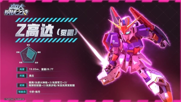 Z高达能够灵活运用自身的武器,友方机体造成暴击时,本机攻击提升10%,暴击提升5%,暴击伤害提升5%,此效果最多可以叠加5次。