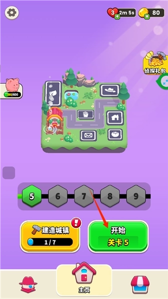 7、点击首页的“建造城镇”选项,通过闯关获取锤子道具来建造城镇。