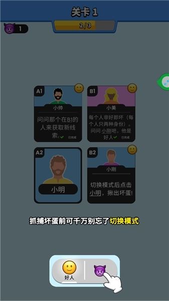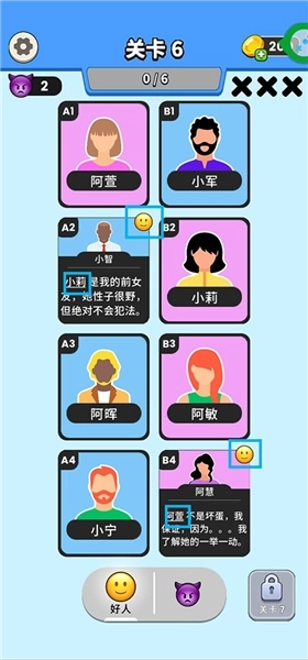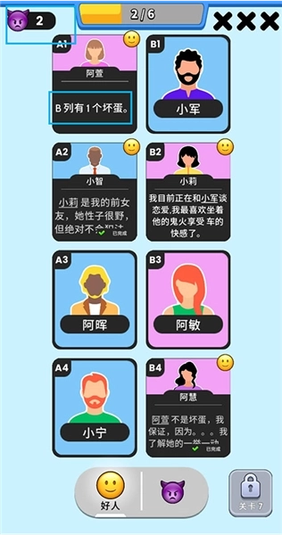 1、根据游戏提供的卡牌线索,小智与阿慧属于好人阵营,他们的发言具备可信度,由此可推断小莉和阿萱同样是好人。