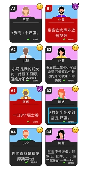 从阿萱的卡牌线索能知道B列存在一个坏人,由于游戏里总共只有两个坏人,所以A列和B列应该是各有一个坏人。