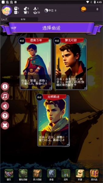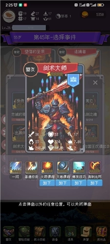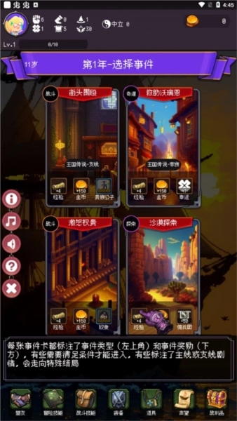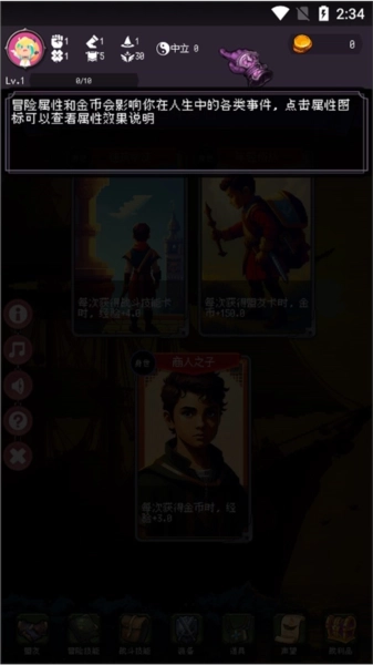 2、冒险属性与金币会对人生中的各类事件产生影响,点击属性图标即可查看属性效果的相关说明;