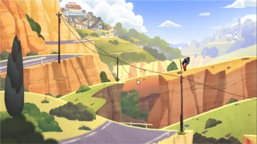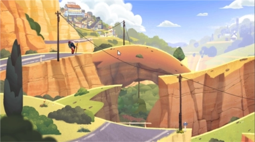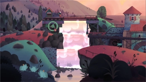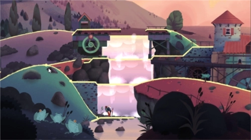 2、进入下一场景:先把浅绿色的路向上拉,接着让老人走到屋顶上,之后把浅绿色的路向下拉、深绿色的路向上拉,最后点击水边位置让老人继续往前走;