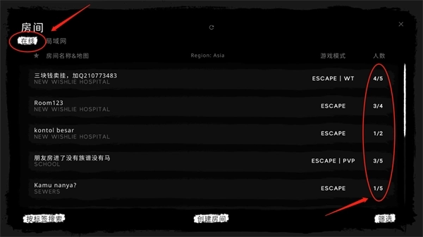 在【房间】界面里,我们能看到其他玩家创建的房间,只要点击任意一个房间,就能和其他游戏玩家一起畅快游玩。
