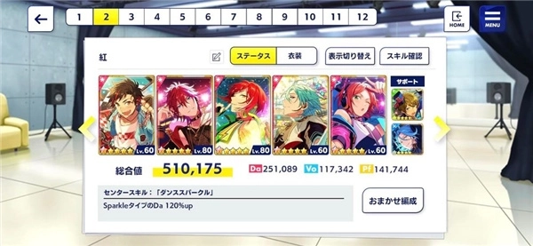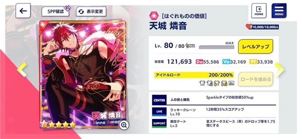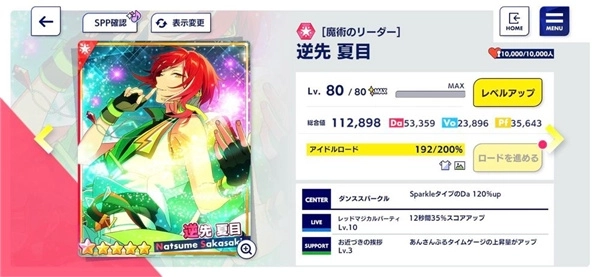 那我们所有队员就必须是「Sparkle类型」和「特化能力值为Da」的卡片,就出现以下组合:会发现队伍皆为Sparkle,且最高特化值为Da,这样所有队员都可以吃到夏目的队长技,且能力值最大化。而这就是「同特化能力」的组法。