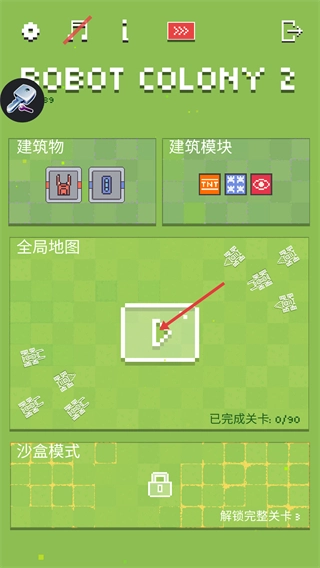 进入【Robot-Colony-2】后,点击全局地图的开始按钮,熟悉【建筑物】和【建筑模块】,开启冒险。