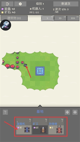 收集【矿石-7】,解锁并开启宝箱来获取资源,把机器人数量提升到10个,强化基地的战斗力,以此应对波次挑战。