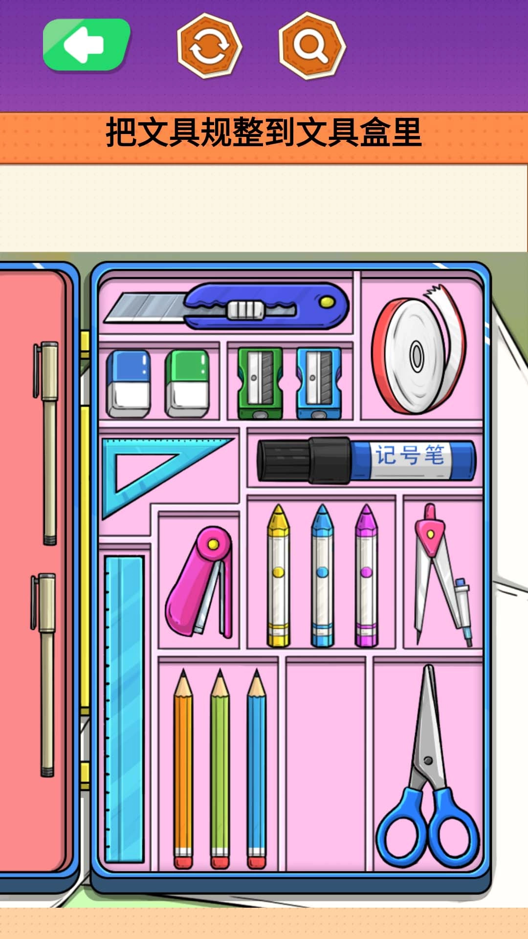 1、玩家需求将每种不同型号和不同色彩的马克笔,依据提示收纳到对应的收纳盒中;