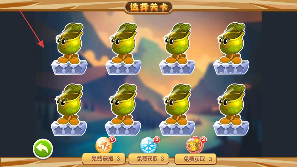 2、在选择关卡的界面中,存在多个以绿色植物形象呈现的关卡。每个关卡下方设有星星,同时还配备了免费获取道具的按钮以及返回按钮。