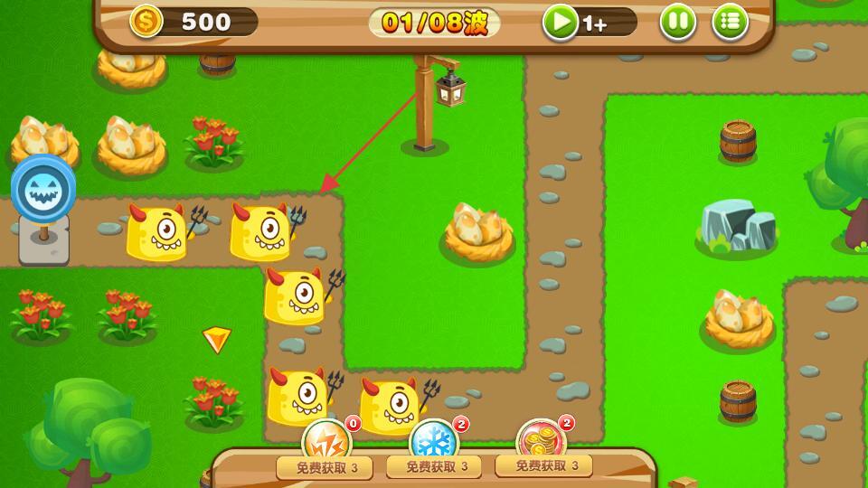 3、在游戏的战斗界面中,第1波敌人将会呈现出来,整个游戏共计8波敌人。怪兽会沿着既定路径移动,界面的上方能够看到金币数量,而界面下方则设有免费获取道具的按钮。