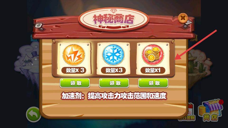 4、在神秘商店界面里,有加速剂、雪花等可供领取的道具。其中,加速剂能够提升攻击力、攻击范围以及速度,此外还有金币道具。每个道具都设有领取按钮。